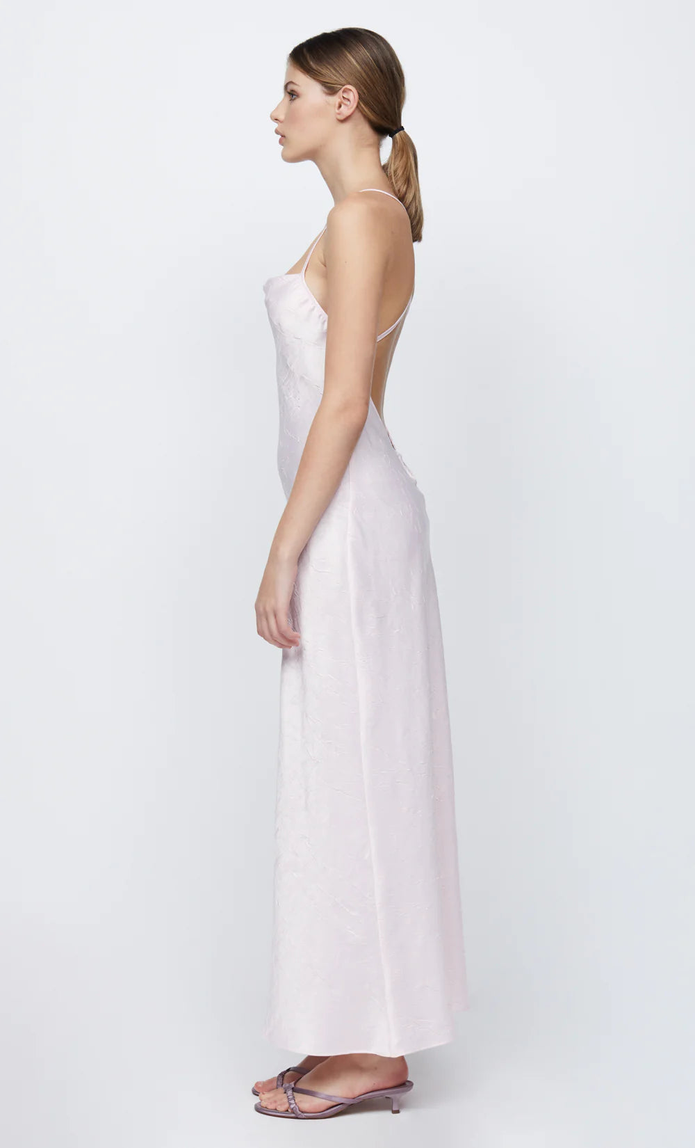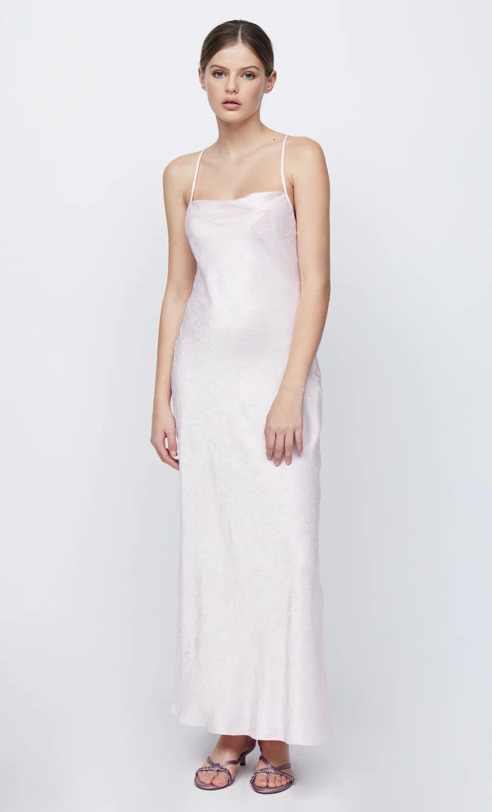 Designed in a flattering silhouette, the Carolina Maxi Dress is cut on the bias from a lustrous fabric. The dress features a slight cowl neckline, self straps and a keyhole opening at the open back that are secured by hook and ball hardware.